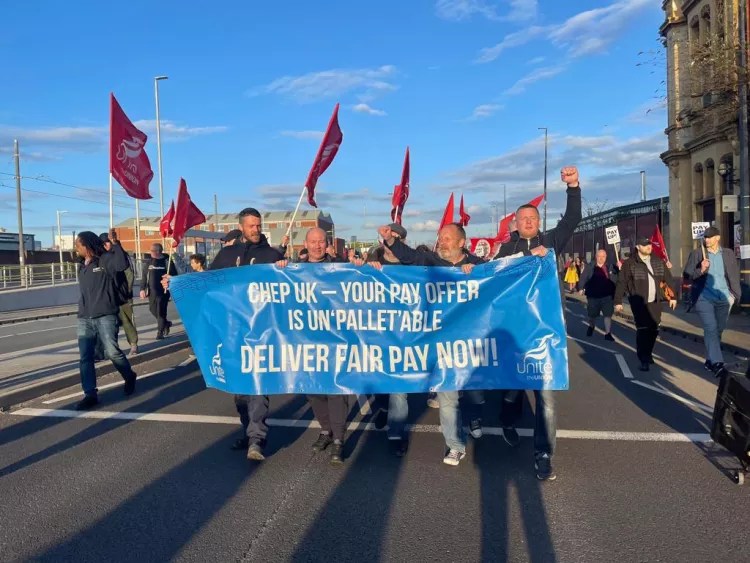 Gary described the picket line, which was in a prime spot on a busy road near the Trafford Centre. Hats off to whoever came up with the pun-tastic banner copy: ‘Don’t be a CHEPskate’. ‘Your pay offers are unPALLETable’.